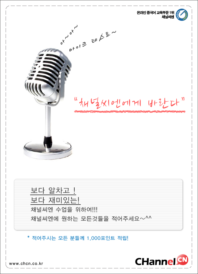 we*** 한달 넘게 채널씨엔을 하면서 중국어에 대한 두려움을 조금 극복한것 같아요~ 그런데 가격이 조금 착하면 더 좋을것 같네요~ 20분씩 매일 하다보니 조금 부담이 크네요 ㅠㅜ 이벤트도 자주 해주시면 좋겠네요~ 그리고 매일 오던 문자가 요즘들어 안오네요? 그리고 집에서는 괜찮은데 외부에 있을 때 전화 연결 상태가 좋지는 않더라구요~ 이런점들이 개선되면 너무 좋을 것 같네요 ^^ (2011.03.24 19:37) 리플달기